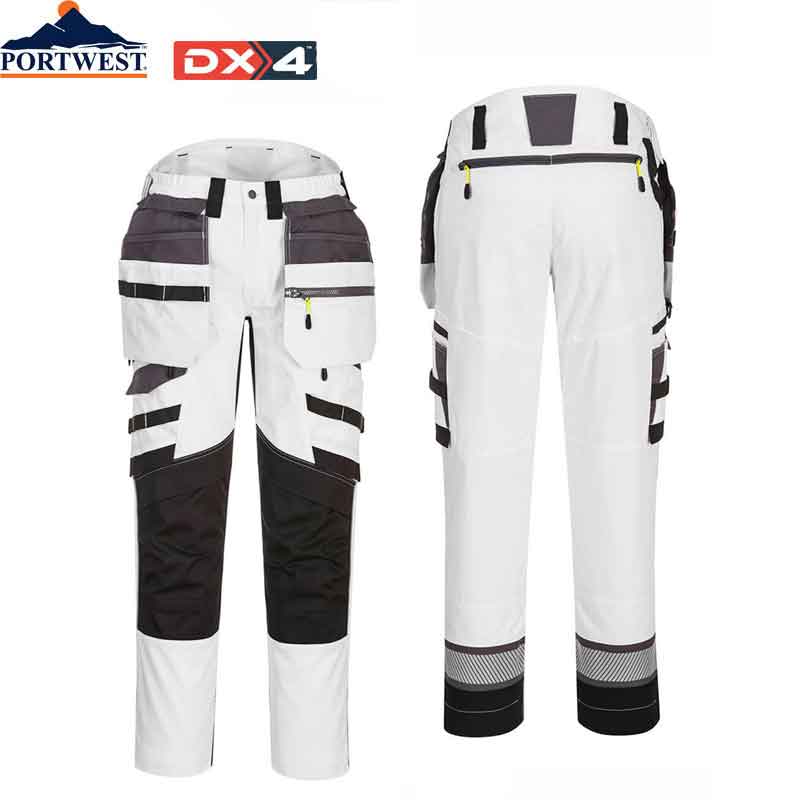Die DX4-Arbeitshose mit abnehmbaren Holstertaschen ist ergonomisch geformt und nutzt die gezielte Platzierung von 4x-Stretch-Stoffen, um beim Arbeiten maximale Bewegungsfreiheit zu gewährleisten. Die Hose hat einen hohen Rückenbund mit seitlichem Gummizug, der in allen Arbeitspositionen Schutz bietet. Verstellbare Knietaschen mit vorgeformten Knien, großzügige Fronttaschen und multifunktionale Oberschenkeltaschen mit Reißverschluss bieten eine sichere Aufbewahrung für Telefon, Stifte und Werkzeug. Dreifachnähte für maximale Haltbarkeit.